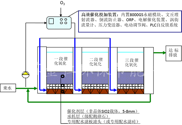 通過高效催化投加裝置後的臭氧和水的混合液,由增效噴嘴進入專業設計的氣水分配濾磚均勻進入貴重金屬的催化劑層,催化劑表麵具有外牆電位,有效的激發產生羥基自由基,羥基自有基的氧化還原電位為E0=2.8ev,在如此高的氧化電位的作用下大部分難降解的有機物發生斷鏈反應形成短鏈的有機物或直接被氧化至CO2和H2O,最終出水可達設計排放標準。永磁高級催化氧化係統的工藝流程如下所示: